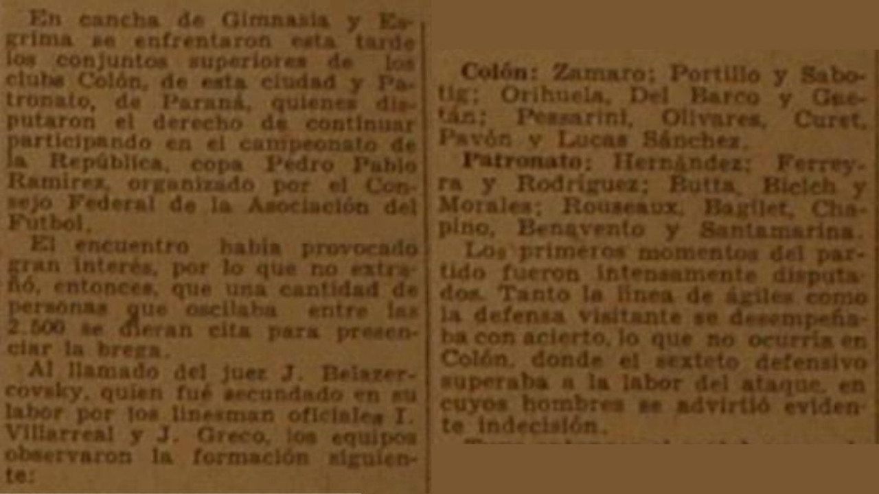 Llegado el momento del cotejo, los elencos presentaron las siguientes formaciones. Patronato: Manuel Hérnandez; Ferreira y Rodríguez; Butta, Bieleh y Morales; Rousseaux, Bagilet, Chapino, Benavento y Santamaria. Mientras que, Colón se alineó con: Zamaro; Portillo y Sabatig; Orihuela, Del Barco y Gaetán; Pesarini, Olivares, Curet, Pavón y Sánchez. El referee fue J. Belazercovsky, quien fue secundado en su labor por los linesman I. Villarreal y J. Greco. Como dato agregado, a raíz del valor de las entradas que tenían un coste entre $1.5 (un peso con cincuenta centavos) y $2 (dos pesos), se recaudó $995 (novecientos noventa y cinco pesos).